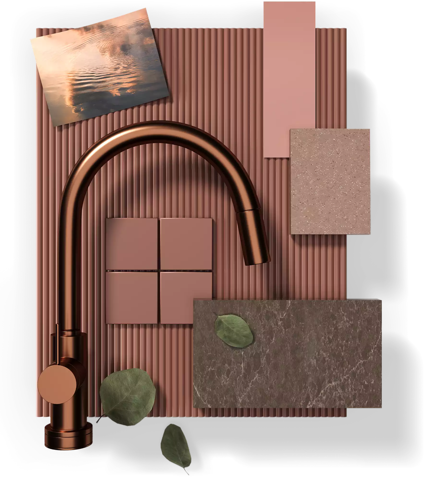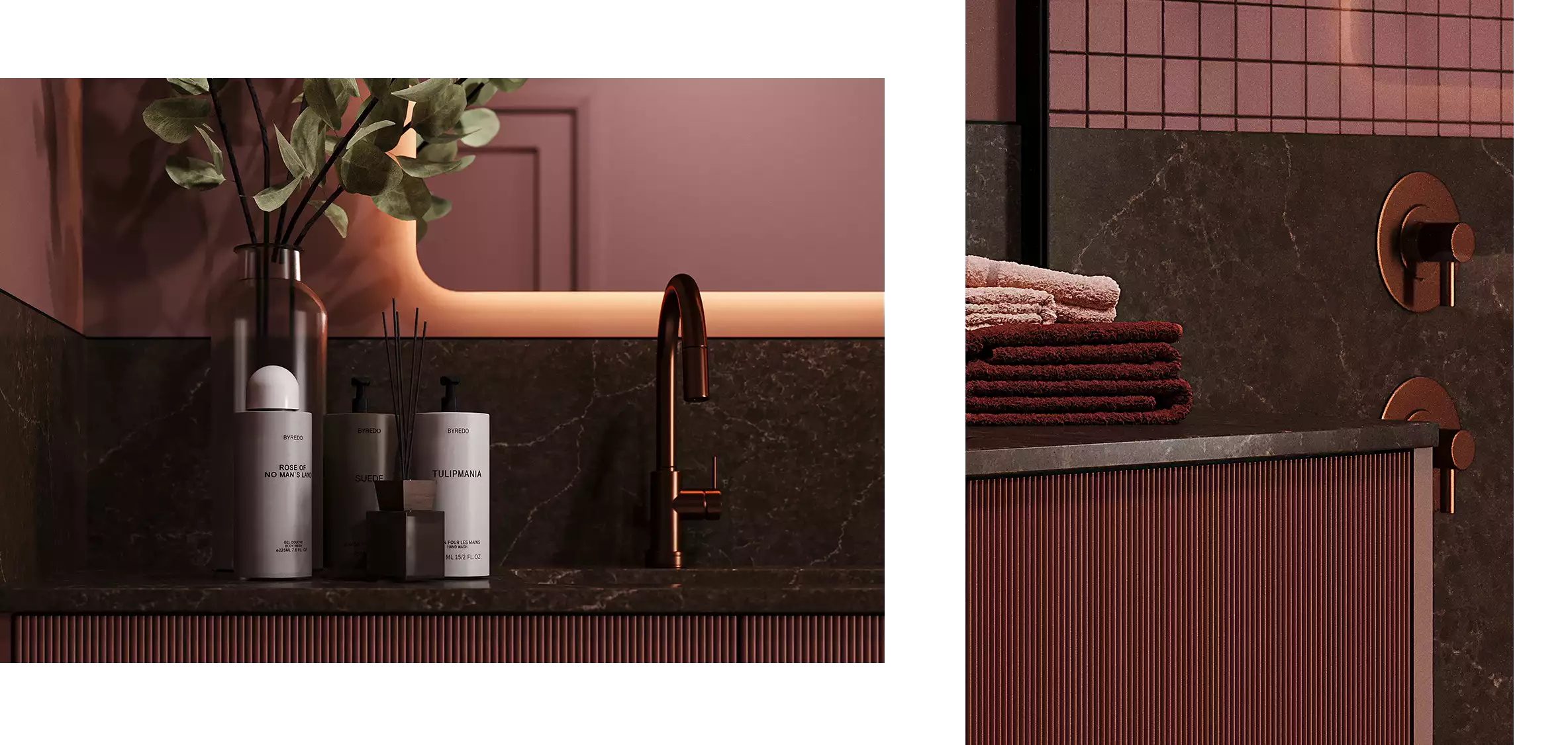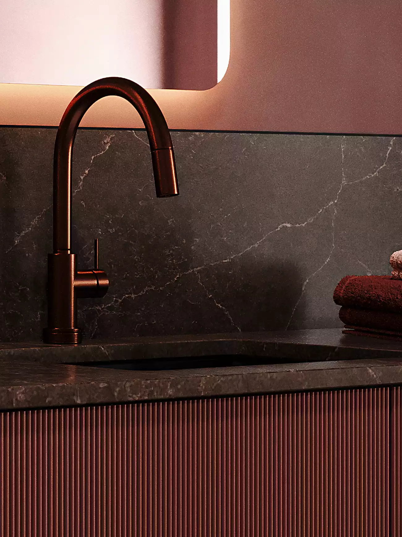 This bathroom is adorned with a matte, textured ceramic red, whose depth creates a soft and enveloping atmosphere. The tone-on-tone approach enhances the cocoon effect, while copper accents and satin finishes add a subtle touch of radiance.