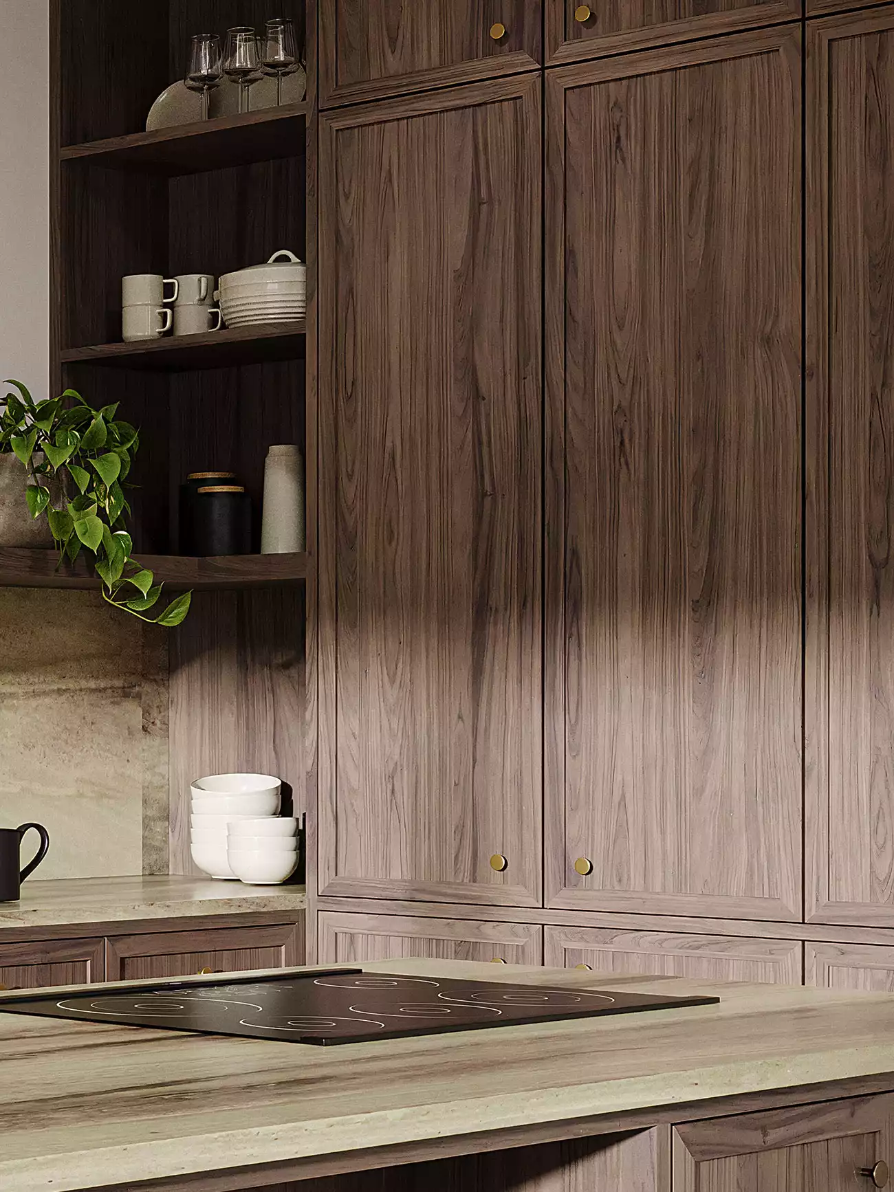 Brut et raffiné à la fois, ce style s’inspire des matières dans leur forme la plus authentique. Les textures minérales, les bois foncés et les finis mats créent une atmosphère chaleureuse, enveloppante et profondément contemporaine.