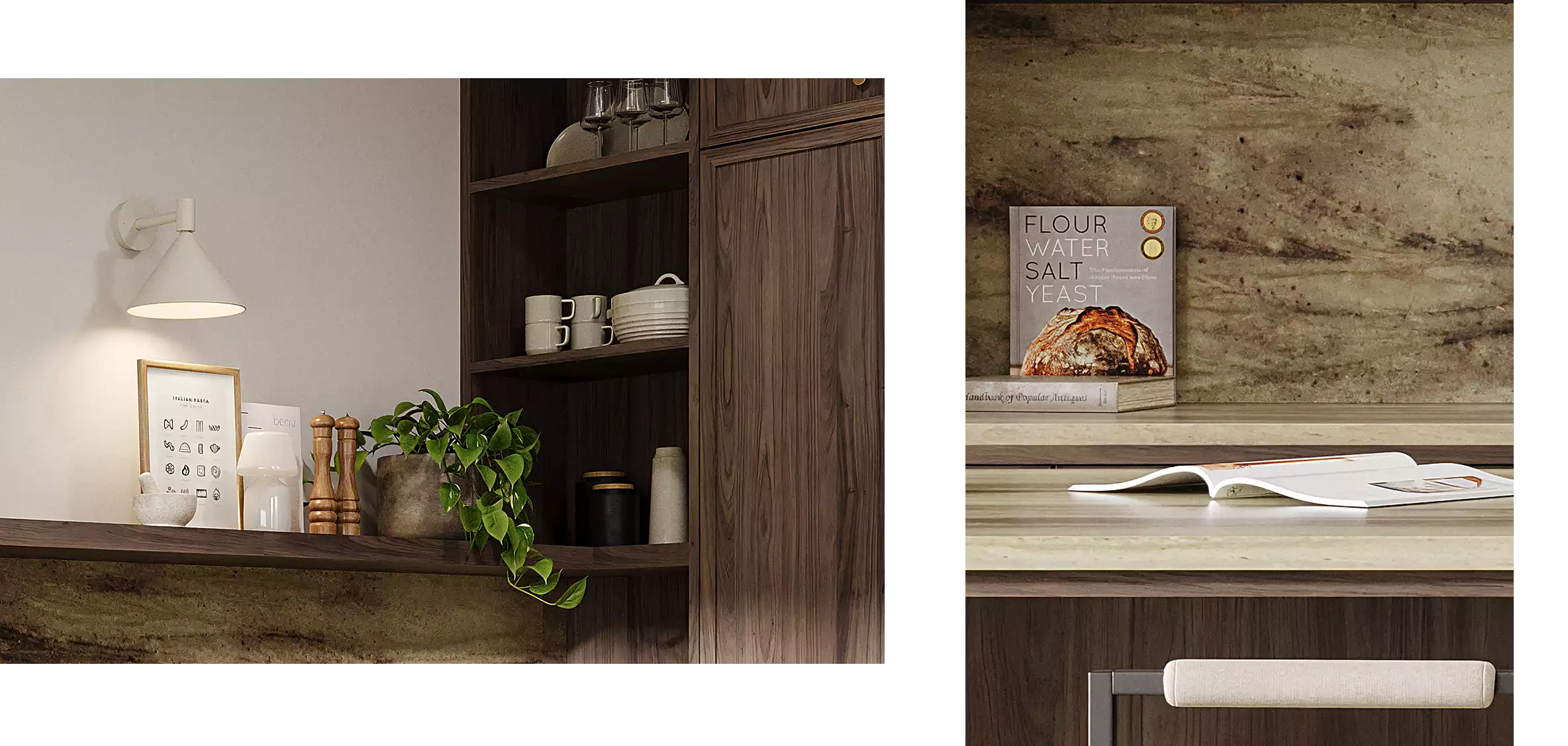 En 2025, l’authenticité prend le devant de la scène : les pierres naturelles avec veinage imposants, les essences foncées et les tonalités terreuses évoquent un retour à l’essentiel, à la fois élégant et durable.